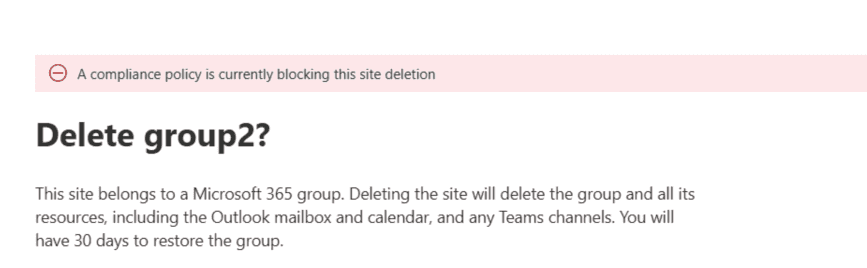 In some Microsoft 365 environments, you may run into an issue where a SharePoint site cannot be deleted because it is still governed by a retention policy—even if the Microsoft 365 Group the site belonged to has already been deleted.